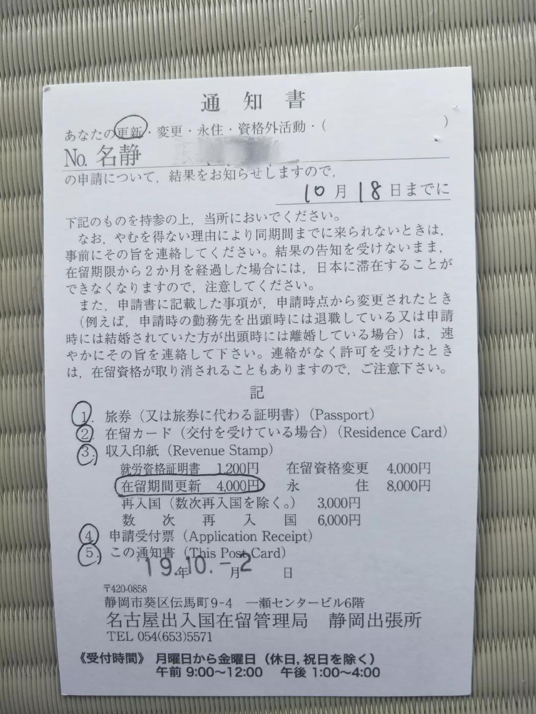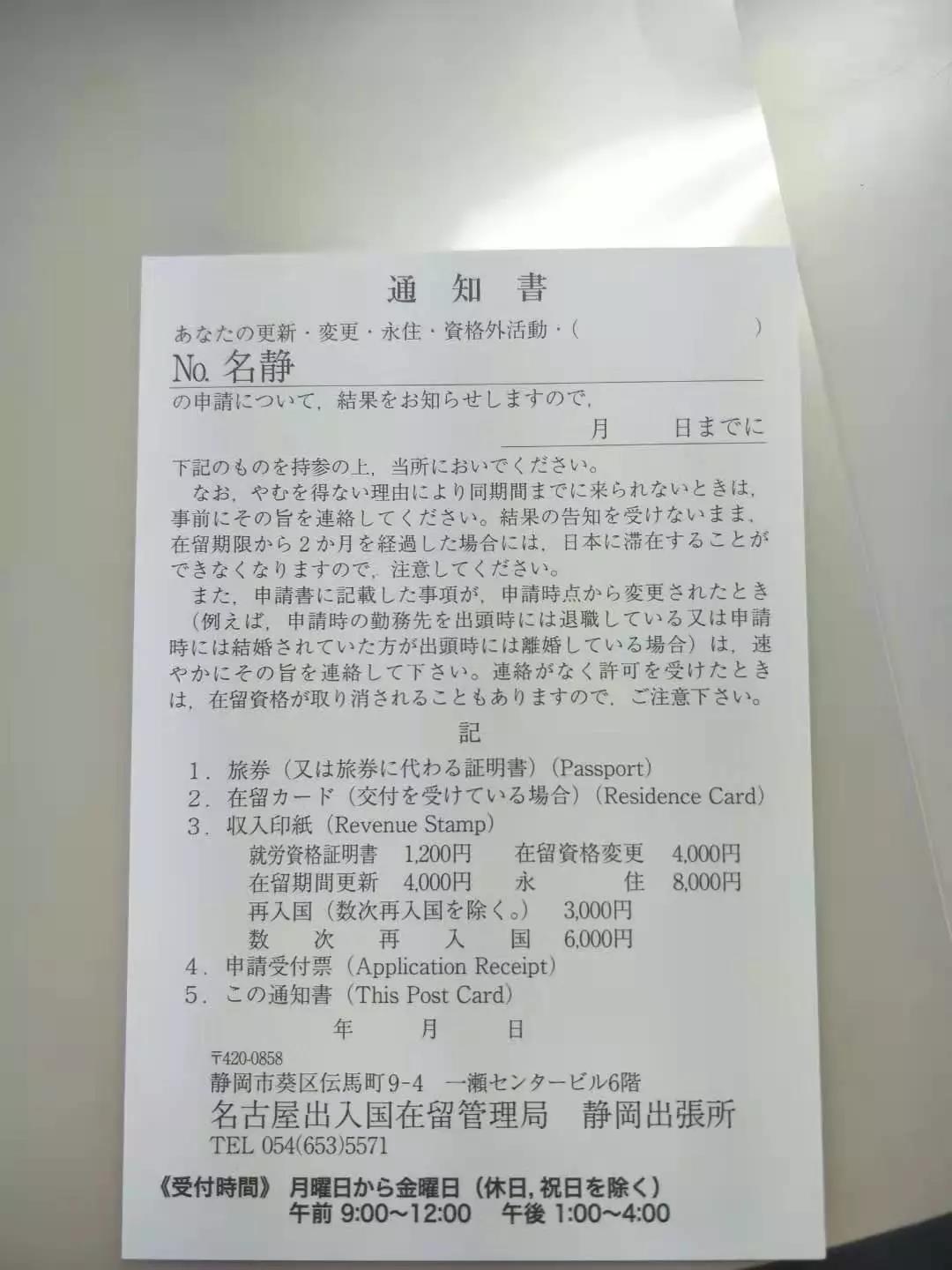 通知你再次來日本入管局領取新的在留卡